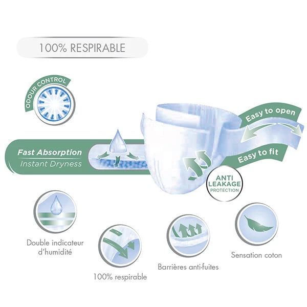 - Ce dispositif médical est disponible en plusieurs tailles en fonction du tour de taille et offre une absorption maximale pour garder la peau sèche et confortable. Il est doté d'un double indicateur d'humidité pour signaler qu'il doit être changé, et de barrières anti-fuites pour une protection accrue.